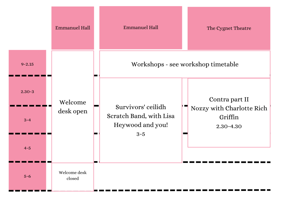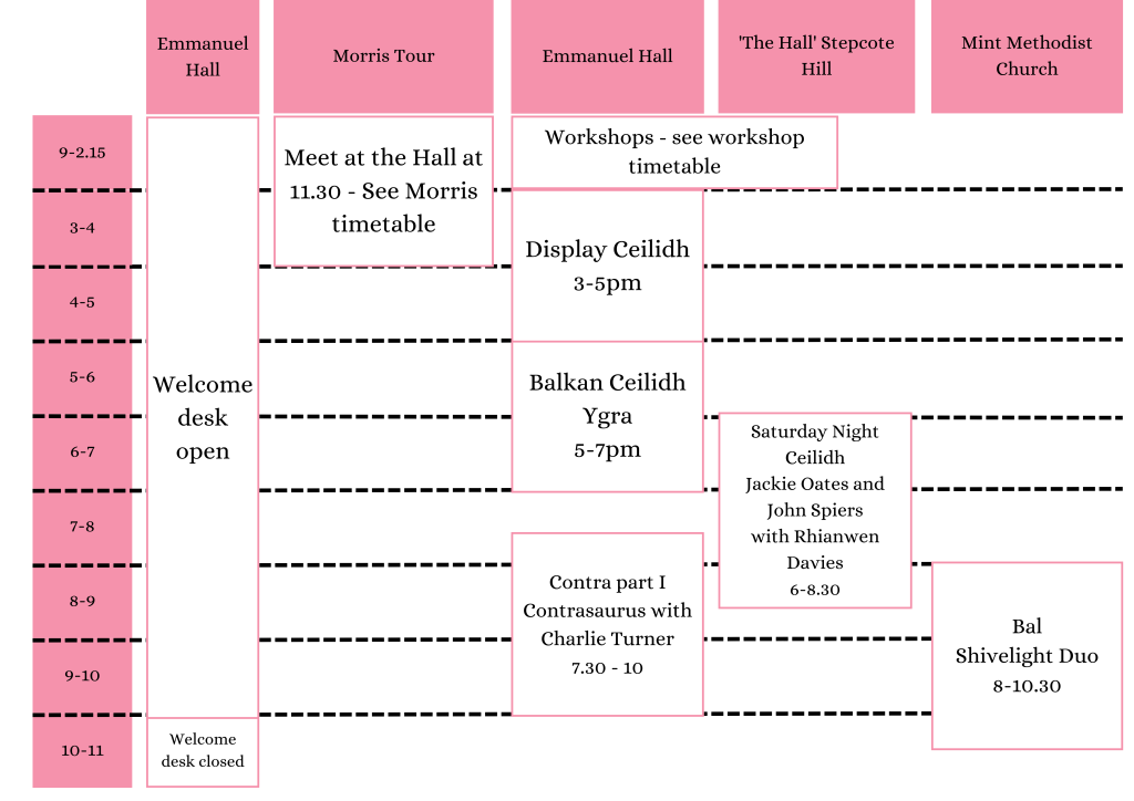 Morris groups should meet at ‘The Hall’ on Stepcote Hill at 11.30. You will be paired with your steward, meet your group, and can head to your first dance point. The gaps are for lunch.